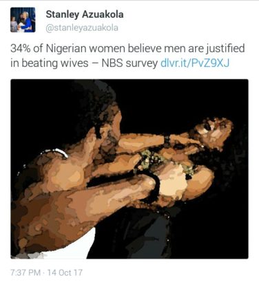 33.7% of Nigerian women believe that a man is justified in beating his wife for at least one of the following five reasons: