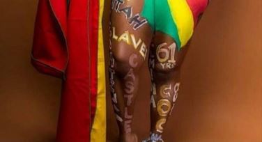 This Ghanaian lady showcased her hot curves by stripping down .Her modesty is only covered by the painting of the Ghanaian flag on her body to mark Ghana’s 61st Independence.