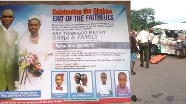 Mr ThankGod Ifeanyi Onyia, Mrs Chinwe Okwudiri Onyia, and their five kids were travelling in a Carina E model vehicle when they collided with a Toyota bus belonging to Onitsha South mass transit along the dilapidated Ugwu-Onyeama axis of Enugu-Onitsha expressway at about 11:00 a.m.