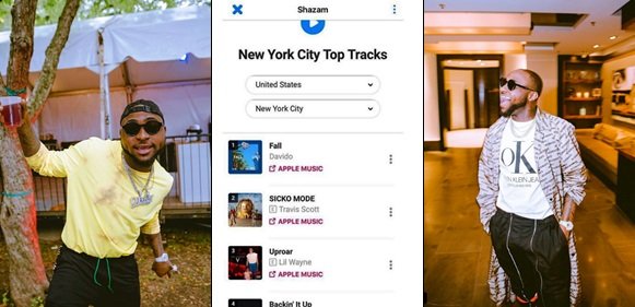 Music tech company Shazam shared a chart of the top 50 songs ‘Shazamed’ in New York and Davido’s tracks ‘Fall’ and ‘If’ were amongst.