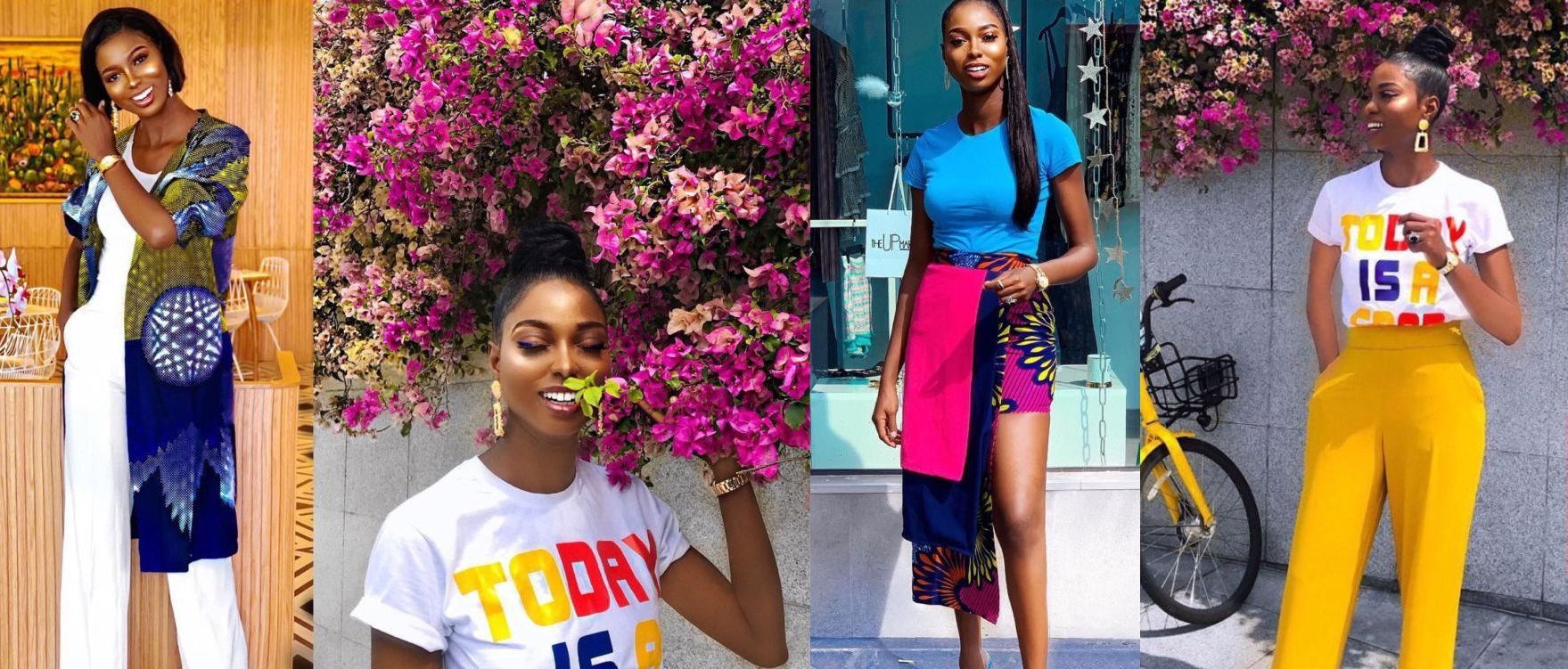 Granted, styling your t-shirt with trousers is great, but how about a skirt? This option adds a dose of femininity that trousers wouldn’t dare. Cup a feel of OlarSlim’s peach skirt and white t-shirt combination or go bold with her Ankara skirt and a blue alternative.