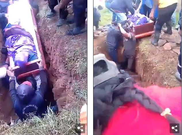 The tragic accident happened in Pampas, in rural Peru, as the pallbearers were lowering the coffin into the grave.