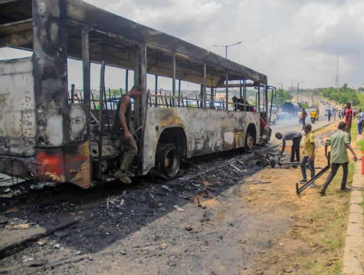 A mass transit bus got burnt along the Lagos-Ibadan Expressway on Monday morning.