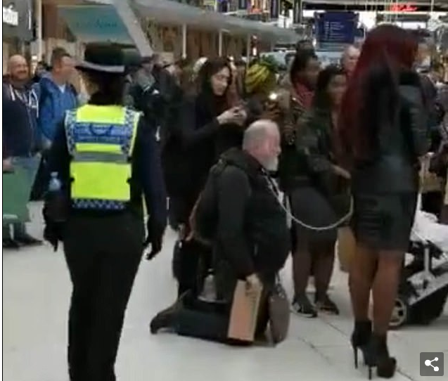 Shortly afterwards, a pair of baffled-looking police officers are seen approaching the man and woman as they make their way through Waterloo Station in central London.