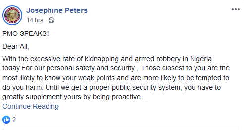 With the excessive rate of kidnapping and armed robbery in Nigeria today.For our personal safety and security , Those closest to you are the most likely to know your weak points and are more likely to be tempted to do you harm. Until we get a proper public security system, you have to greatly supplement yours by being proactive.