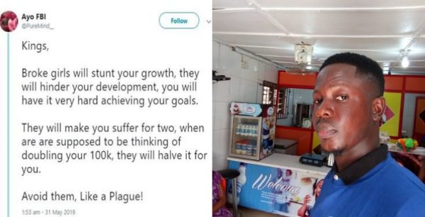 A Nigerian man has taken to Twitter to advise fellow men to stay away from broke girls which he says can stunt a person’s growth.