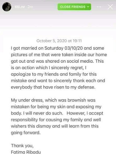 Nuhu Ribadu’s daughter, Fatima, the new daughter-in-law of former Vice President, Atiku Abubakar, has regretted the choice of dress she wore for her wedding which caused a stir on social media among adherents of the Islamic Faith.