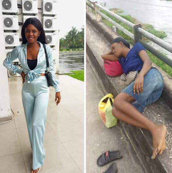 Facebook user, Queen Favour posted a photo, writing “Kardi Blinkz dey suffer o. She is currently sleeping on top Otuoke bridge.”