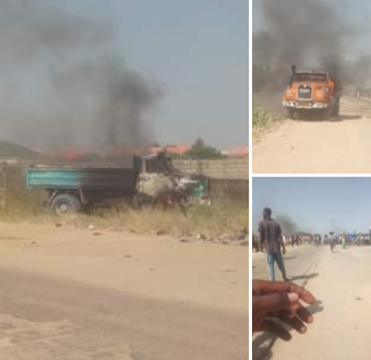 An angry mob, including motorists, were said to have stormed the location of the auto crash and set the two trucks responsible for the accident ablaze.
