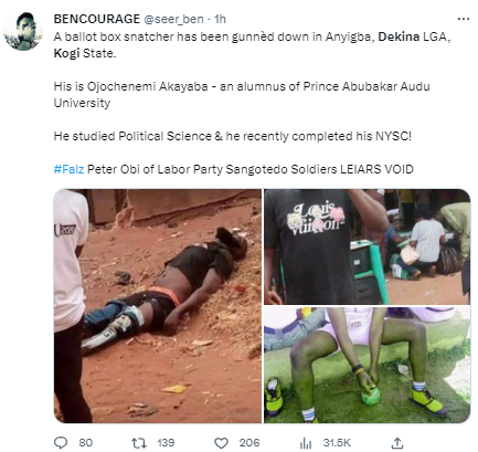 Alleged ballot box snatcher, Ojochenemi Akayaba, gunned down in Kogi State