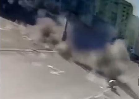 Moment a Russian rocket narrowly misses Ukrainian woman carrying her shopping as it explodes just yards away from her in…