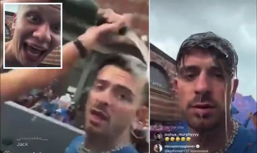 Jack Grealish looks far from impressed after team-mate Erling Haaland mischievously drenches him in champagne