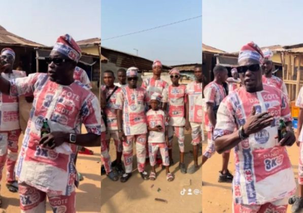 “I wish to be a house owner” – Man uses Dangote cement bags to make cloth after buying 1 plot…