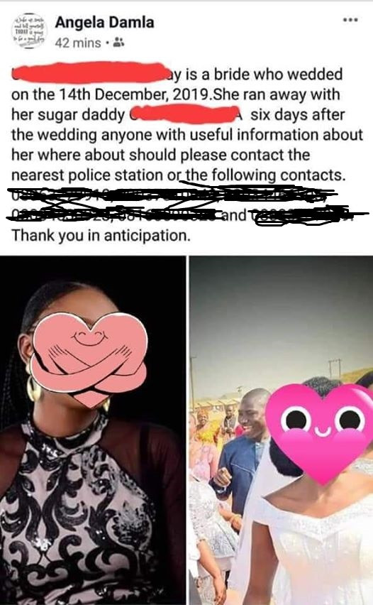 A bride allegedly left her new husband six days after their wedding and ran away with her boyfriend.