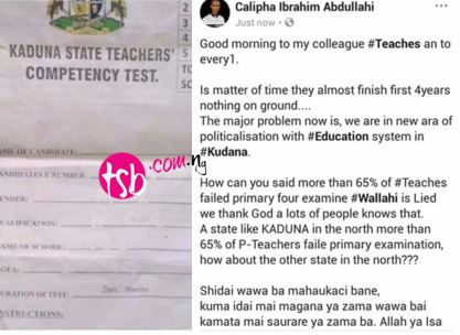Inside Life See What One Of The Teachers Who Failed Primary 4 Exam In Kaduna Wrote TSB News Oct 12, 2017 0 The viral post is from one of the 21,780 teachers who failed the primary four test in Kaduna State. If… Read More