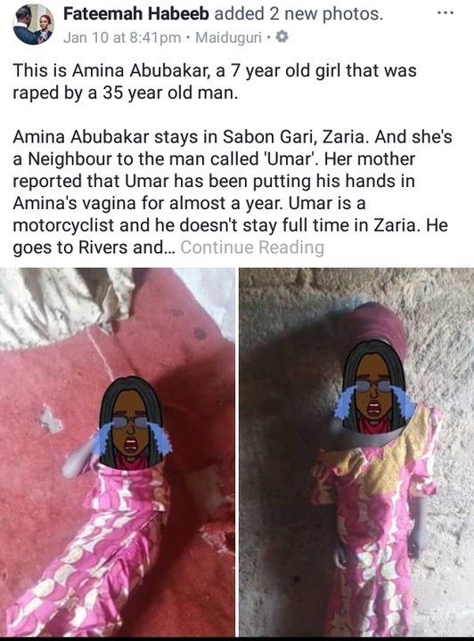 Inside Life 35-Year-Old Man Rapes 7-Year-Old Girl In Zaria, Puts Hands Inside Her Vagina TSB News Jan 11, 2018 0 As shared by Fateemah….. ‘This is Amina Abubakar, a 7 year old girl that was raped by a 35 year… Read More